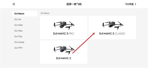 2.選擇要連接的飛機(jī)型號(hào),如“DJI MAVIC3CLASSIC”。