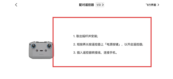 4.按照提示配對(duì)遙控器:取出搖桿并安裝,短按再長(zhǎng)按遙控器電源鍵開啟遙控器,插入遙控器轉(zhuǎn)接線連接手機(jī),完成后即可連接飛機(jī)。