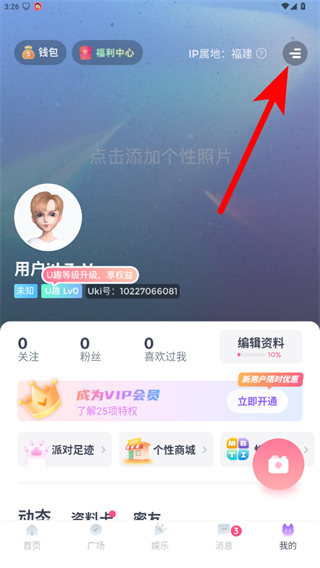 1、打開Uki APP,進入我的頁面,點擊右上角三條橫線圖標,展開側(cè)邊欄。