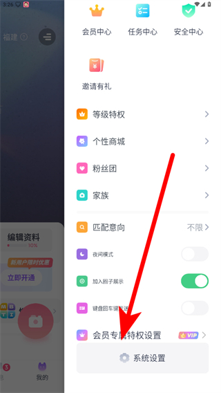 3、在彈出的隱藏菜單中,向下滑動找到并點擊系統(tǒng)設(shè)置選項,進入設(shè)置界面。