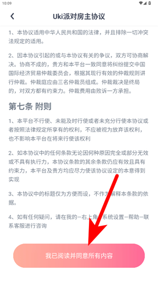 2、在Uki派對房主協(xié)議頁面,點擊我已閱讀并同意所有內(nèi)容按鈕。