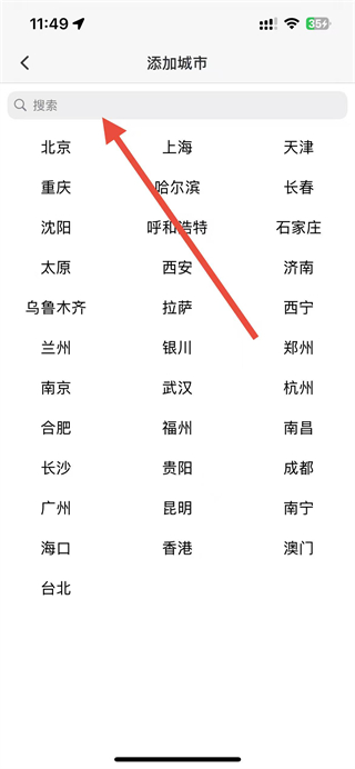 3、在添加城市頁(yè)面,可通過(guò)搜索框搜索或直接點(diǎn)擊城市名稱來(lái)選擇要添加的城市。