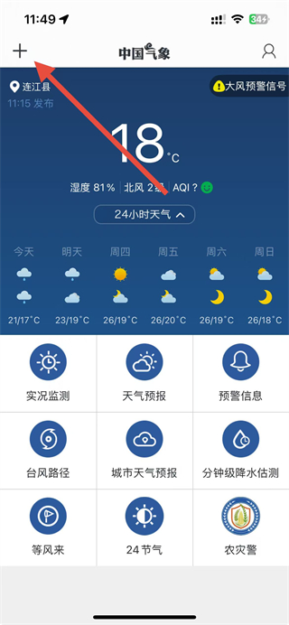 1、打開(kāi)中國(guó)氣象APP,點(diǎn)擊左上角加號(hào)圖標(biāo)。