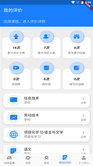 包括查看個(gè)人評(píng)價(jià)統(tǒng)計(jì)和發(fā)章動(dòng)態(tài)。個(gè)人評(píng)價(jià)統(tǒng)計(jì)包括教師或班主任個(gè)人的累計(jì)評(píng)價(jià)次數(shù)、累計(jì)評(píng)價(jià)人數(shù)、家長(zhǎng)累計(jì)回復(fù)次數(shù)、上傳視頻或照片次數(shù)、撰寫評(píng)語數(shù),也可以選擇自己的某個(gè)課班,查看該課班的評(píng)價(jià)詳情。發(fā)章動(dòng)態(tài)包括個(gè)人的發(fā)章動(dòng)態(tài)和全校的發(fā)章動(dòng)態(tài)。