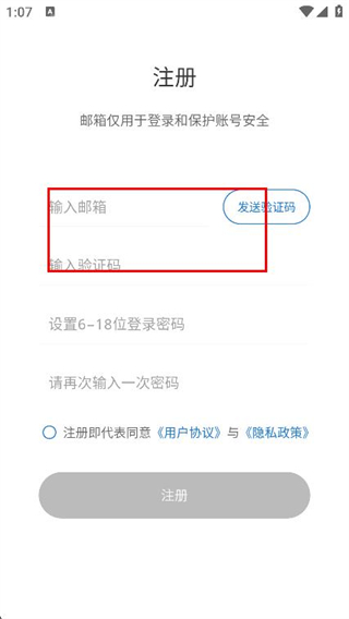 3、進(jìn)入注冊(cè)頁(yè)面后,填寫(xiě)郵箱地址和驗(yàn)證碼。