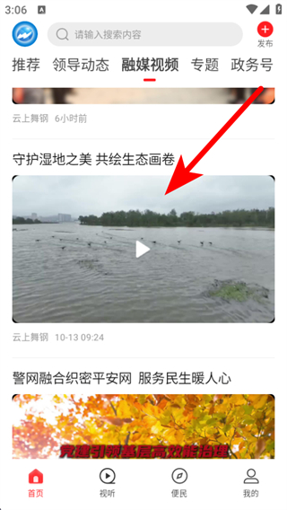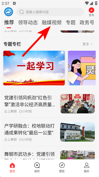 1、打開云上舞鋼APP首頁,點(diǎn)擊融媒視頻,進(jìn)入融媒視頻頁面。