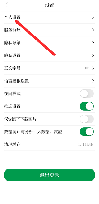 3、在設(shè)置的頁面,需要點擊個人設(shè)置的按鈕,進入個人資料頁面。