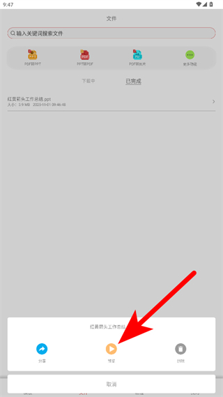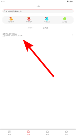 3、下載完成后,在文件頁(yè)面找到紅黃箭頭工作總結(jié).ppt文件。