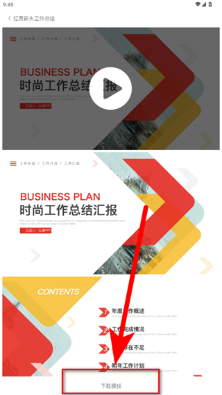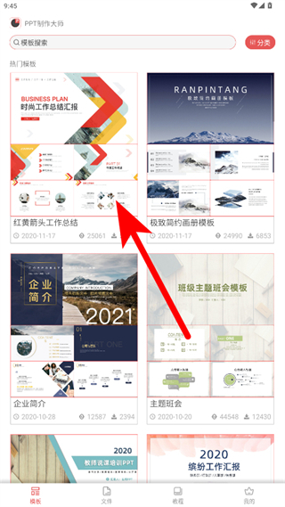 1、打開PPT制作大師APP,在模板頁(yè)面選擇紅黃箭頭工作總結(jié)模板,進(jìn)入模板詳情頁(yè)。