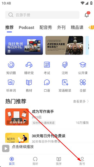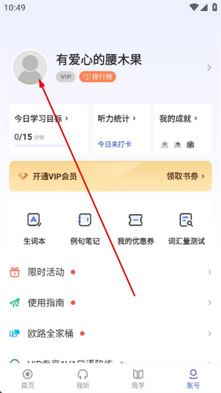 1、打開(kāi)每日英語(yǔ)聽(tīng)力app,點(diǎn)擊底部導(dǎo)航欄中的賬號(hào)選項(xiàng)。