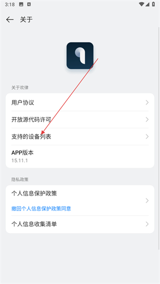 2、在關(guān)于頁面,點(diǎn)擊支持的設(shè)備列表選項(xiàng)。