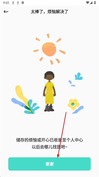 4、最后在太棒了,煩惱解決了頁面,點(diǎn)擊謝謝,即可完成煩惱解決流程,相關(guān)記錄會收錄至個人中心。