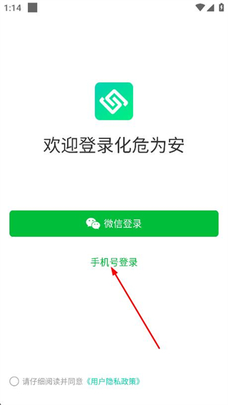 1、打開化危為安app,在登錄頁面點(diǎn)擊手機(jī)號碼登錄。