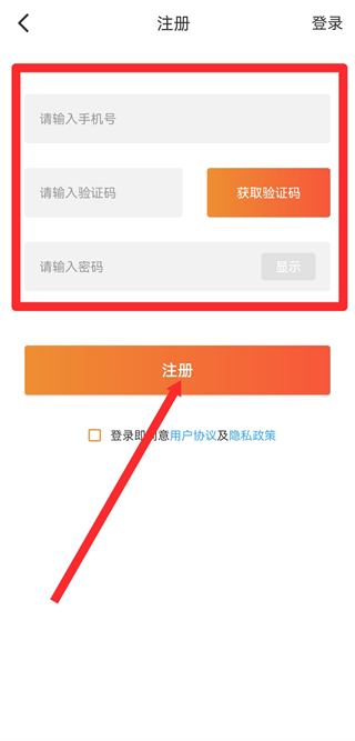 4、在注冊頁面輸入手機號等信息,點擊注冊,完成賬號注冊操作。