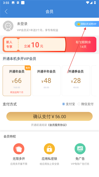 3、進入會員頁面后,點擊領(lǐng)取3天試用VIP按鈕。