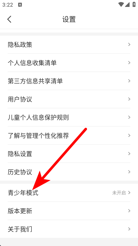 3、在設(shè)置頁面,點擊青少年模式選項,進(jìn)入青少年模式說明界面。