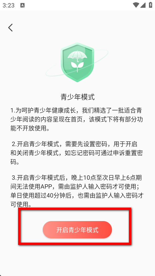 4、在青少年模式說明界面,點擊開啟青少年模式按鈕,即可開啟該模式。