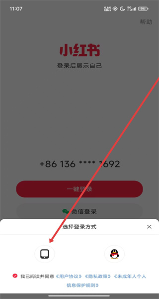 1、在小紅書(shū)選擇登錄方式彈窗中,點(diǎn)擊手機(jī)圖標(biāo),進(jìn)入本機(jī)號(hào)碼相關(guān)的登錄頁(yè)面。