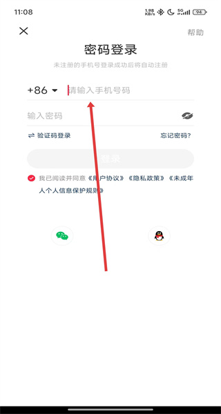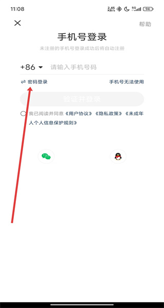 3、在手機(jī)號(hào)登錄界面,點(diǎn)擊密碼登錄按鈕,可以切換為使用密碼登錄方式。