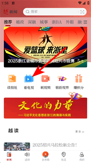1、打開今日越城APP,點擊看電視的按鈕,進入看電視的板塊。