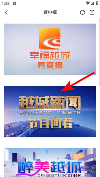 2、在看電視的板塊中,找到越城新聞節(jié)目回看,點擊進入節(jié)目列表頁面。