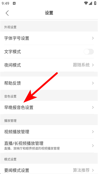 3、在設(shè)置的頁面,點(diǎn)擊早晚報(bào)音色設(shè)置,進(jìn)入音色切換的界面。