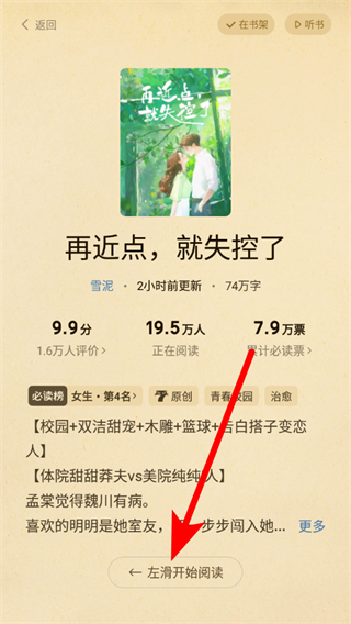 2、在小說詳情頁面,左滑開始閱讀,進入小說閱讀界面。