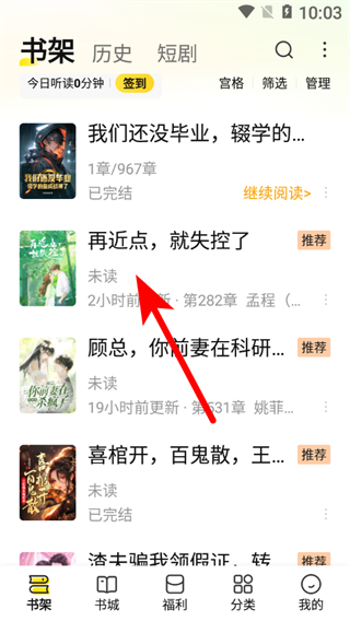 1、在七貓小說書架頁面,點擊想要添加書簽的小說,進入小說詳情頁面。