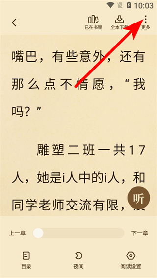 3、在小說閱讀界面,點擊右上角更多選項,彈出功能菜單。