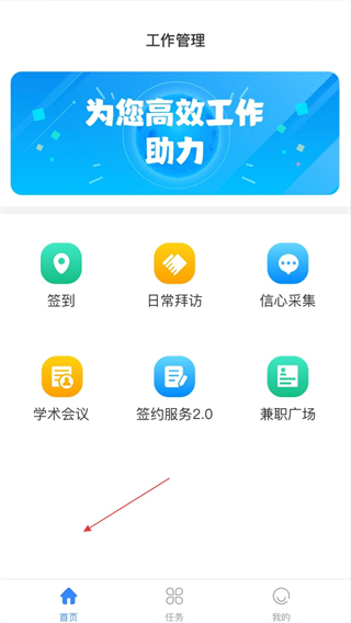 3、注冊(cè)成功后即可進(jìn)入APP首頁(yè),使用簽到、日常拜訪等工作管理功能。