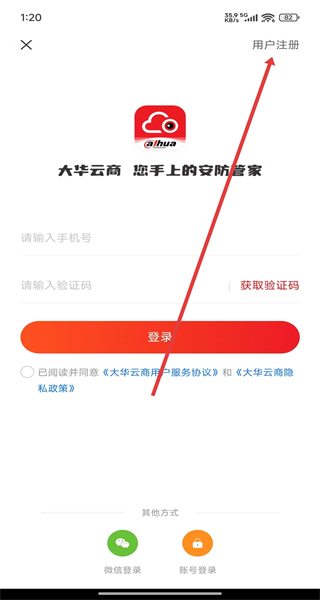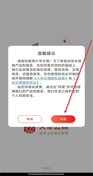 1、點(diǎn)擊“大華云商隱私政策及服務(wù)協(xié)議”彈窗的“同意”,進(jìn)入大華云商主界面。