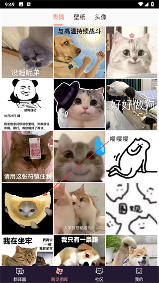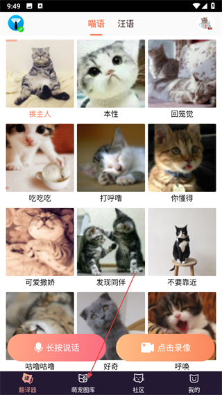 1、打開貓語翻譯器應(yīng)用,點(diǎn)擊底部的萌寵圖庫選項(xiàng)。