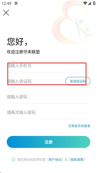 2、進入注冊頁面后,輸入手機號碼和驗證碼。