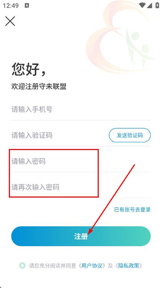 3、設(shè)置密碼并確認,點擊注冊即可完成注冊。