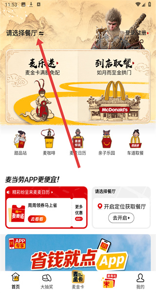 1、打開麥當勞APP首頁,點擊請選擇餐廳,進入餐廳選擇界面,開啟后續(xù)選店流程。