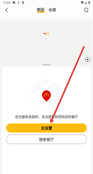 2、若定位服務未授權,點擊去設置按鈕進行授權,授權后即可查看附近的麥當勞餐廳列表。