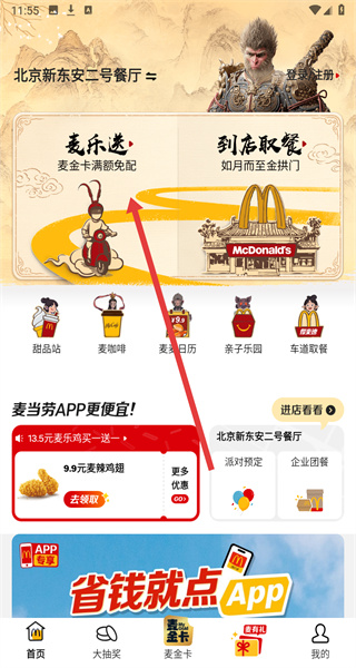 4、成功選定北京新東安二號餐廳后,可在頁面中選擇麥樂送或到店取餐等服務,開展點餐等后續(xù)操作。