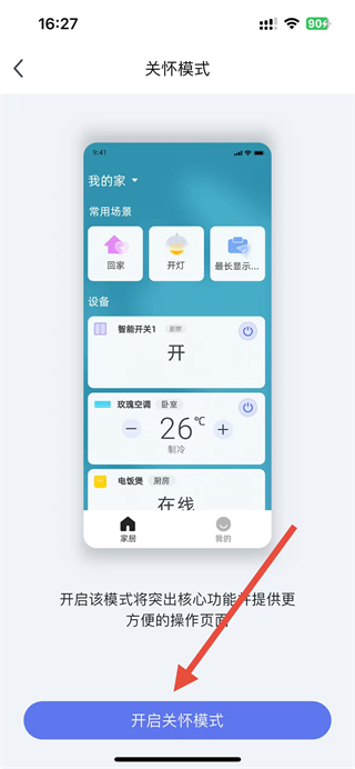 4、在關(guān)懷模式設(shè)置頁面,點擊開啟關(guān)懷模式按鈕,即可開啟關(guān)懷模式。