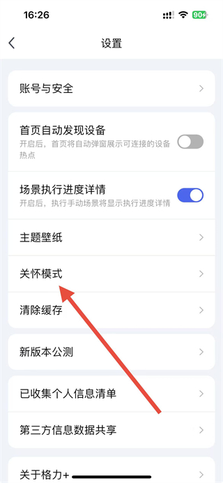 3、在設(shè)置頁面,點擊關(guān)懷模式選項,進(jìn)入關(guān)懷模式設(shè)置頁面。