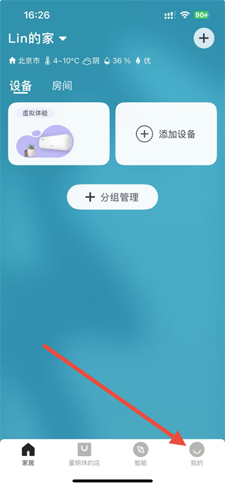 2、進(jìn)入設(shè)備界面后,點擊底部導(dǎo)航欄右下角的我的,切換至個人中心頁面,查看賬號相關(guān)功能。