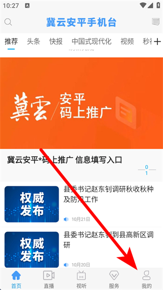 1、打開冀云安平APP首頁(yè),點(diǎn)擊底部我的,進(jìn)入個(gè)人功能板塊頁(yè)面。