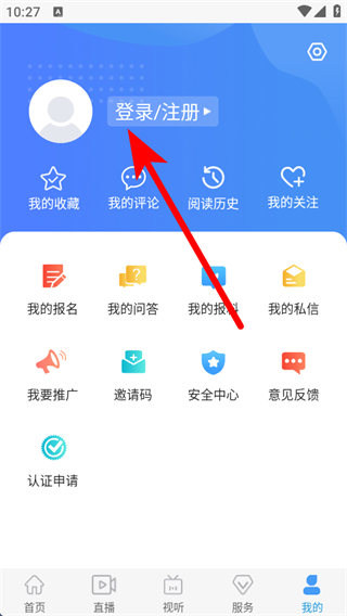 2、在個(gè)人功能板塊頁(yè)面,點(diǎn)擊登錄/注冊(cè)入口,進(jìn)入登錄注冊(cè)選擇界面。