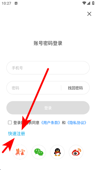 3、在登錄注冊(cè)選擇界面,點(diǎn)擊快速注冊(cè),進(jìn)入賬號(hào)注冊(cè)信息填寫頁(yè)面。