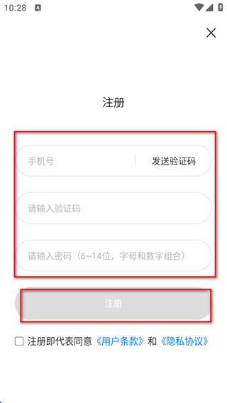 4、在頁(yè)面依次輸入手機(jī)號(hào)等信息,勾選協(xié)議后點(diǎn)擊注冊(cè),完成賬號(hào)注冊(cè)操作。