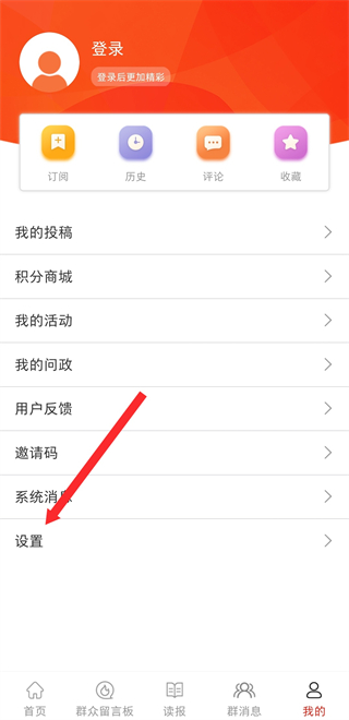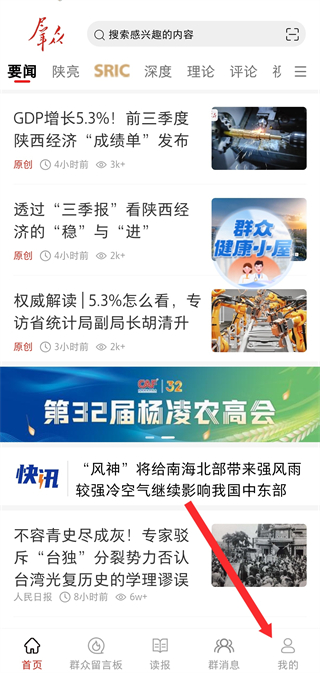 1、打開群眾新聞首頁(yè),點(diǎn)擊底部我的,進(jìn)入個(gè)人功能操作頁(yè)面。
