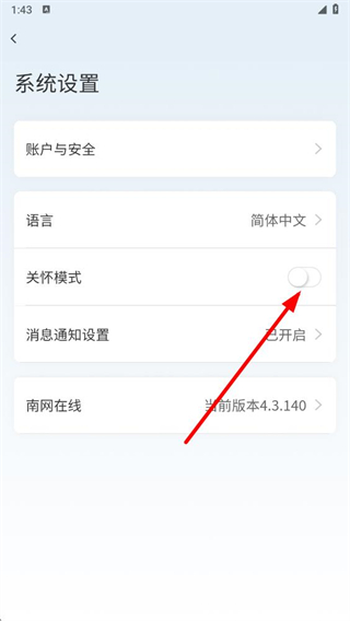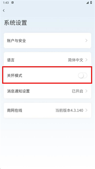 4、點(diǎn)擊其右側(cè)的開(kāi)關(guān)按鈕,開(kāi)啟關(guān)懷模式開(kāi)關(guān)后,即可啟用該模式。