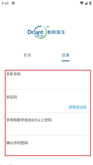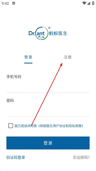 1、打開螞蟻醫(yī)生APP,在登錄注冊頁面點擊注冊。