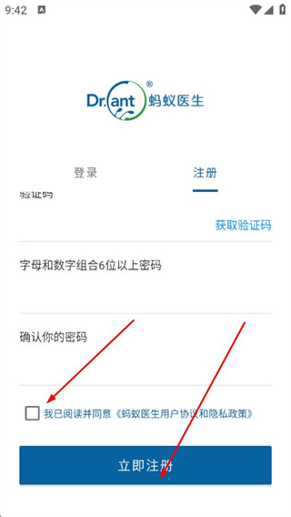 3、勾選同意用戶協(xié)議和隱私政策后,點擊立即注冊,完成賬號注冊流程。