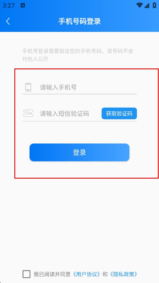 4、輸入手機(jī)號(hào),勾選同意用戶協(xié)議和隱私政策,點(diǎn)擊獲取驗(yàn)證碼,輸入驗(yàn)證碼后點(diǎn)擊登錄。