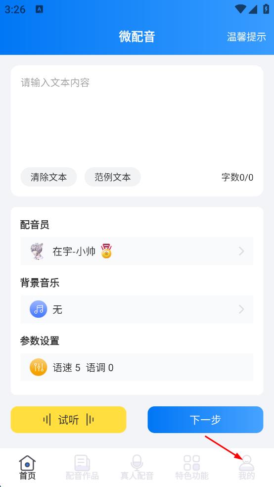 1、打開(kāi)微配音軟件,點(diǎn)擊右下角我的,進(jìn)入個(gè)人頁(yè)面。